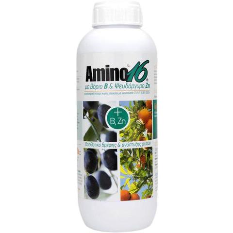 Το Αmino 16® με B & Zn είναι το αποτέλεσμα ενός εξαιρετικού συνδυασμού του Amino 16 ® και υψηλής ποιότητας ιχνοστοιχείων του Βορίου και του Ψευδαργύρου, στοιχείων με πολύτιμη συμβολή στη θρέψη των φυτών, ιδιαίτερα στα εσπεριδοειδή, στην ελιά και στα φυτά μεγάλης καλλιέργειας.