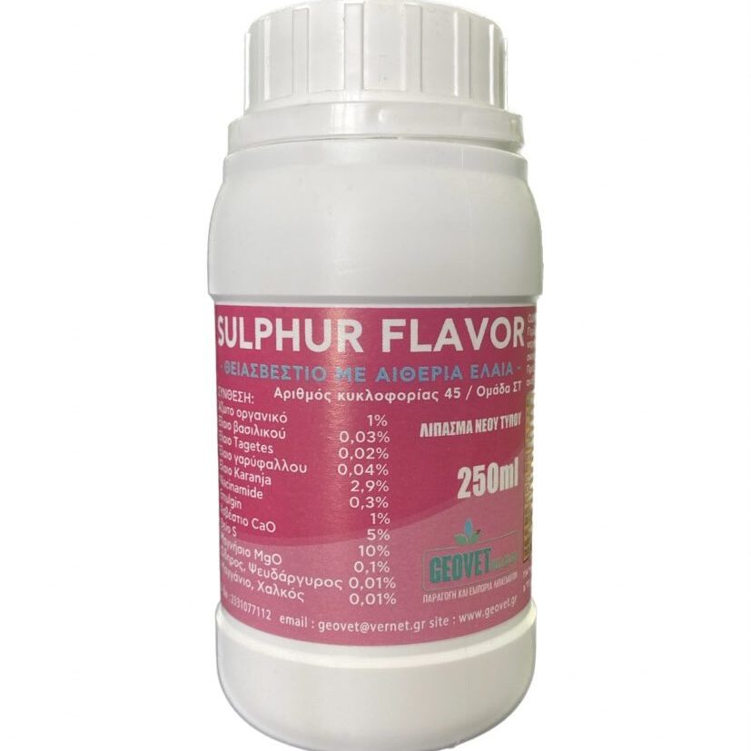 To Sulphur Flavor είναι ένα βιολογικό εντομοκτόνο/μυκητοκτόνο ευρέου φάσματος όπου καταπολεμάει τα εξής έντομα/μύκητες : τις κάμπιες, την ψύλλα,το δορυφόρο,το βοτρύτη,το ωίδιο,την tuta και την βαμβακάδα.